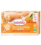 Bébé doit réunir les conditions suivantes pour pouvoir croquer les boudoirs BABYBIO : – il a déjà deux dents – il sait manger un morceau de pain – il sait manger des plats avec de petits morceaux – il se tient assis tout seul dans sa chaise bébé – Pour sa sécurité, c’est sous la surveillance attentive d’un adulte et assis bien droit que bébé peut déguster son boudoir Babybio. Dès 8 mois – en bouillie uniquement : Au bol, émietter 1 ou 2 boudoirs dans 150ml de lait de suite chaud ou froid. Attendre 1 minute. Bien écraser à la cuillère jusqu’à obtenir une bonne dissolution du biscuit. Au biberon, émietter 1 boudoirs dans le biberon de lait de suite tiède, attendre une 1min et secouer vigoureusement jusqu’à obtenir une bonne dissolution du iscuit. Dès 10 mois : à croquer si bébé est prêt, la forme et la taille du boudoir Babybio ont été spécialement étudiées pour une utilisation pendant la percée des dents.