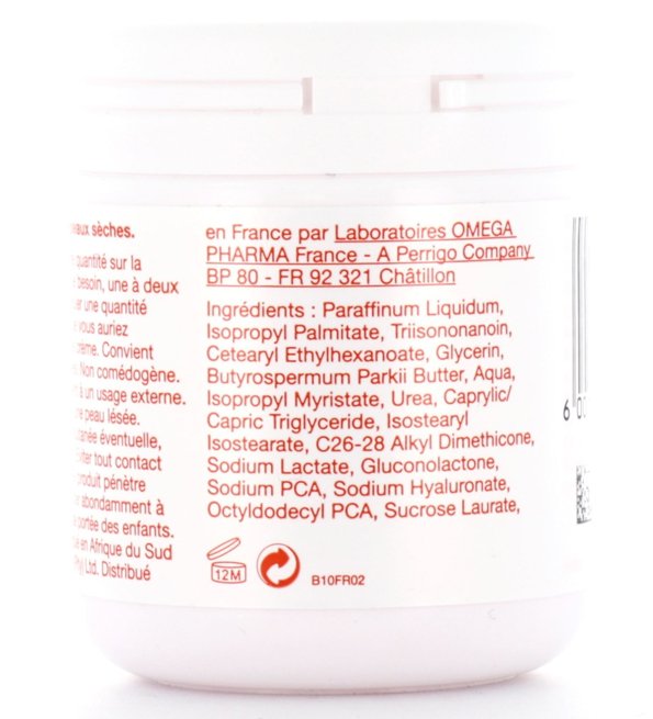 – des extraits de plantes (Lavande, Romarin, Camomille)- de la glycérine- de l’urée- de l’acide hyaluronique- des céramides- un dérivé de vitamine A et de la vitamine E