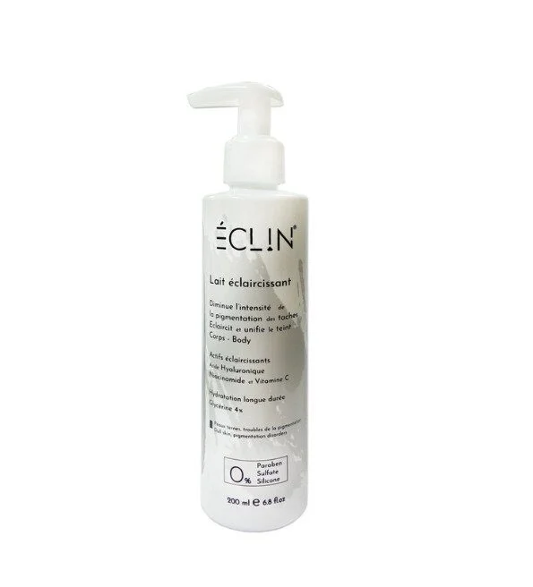ECLIN lait éclaircissant 200mL formulé pour aider à réduire l’intensité de la pigmentation des taches brunes, éclaircir et unifier le teint tout en hydratant en profondeur. Ce produit contient des ingrédients tels que l’acide hyaluronique, la niacinamide et la vitamine C, qui peuvent aider à améliorer l’apparence de la peau.
