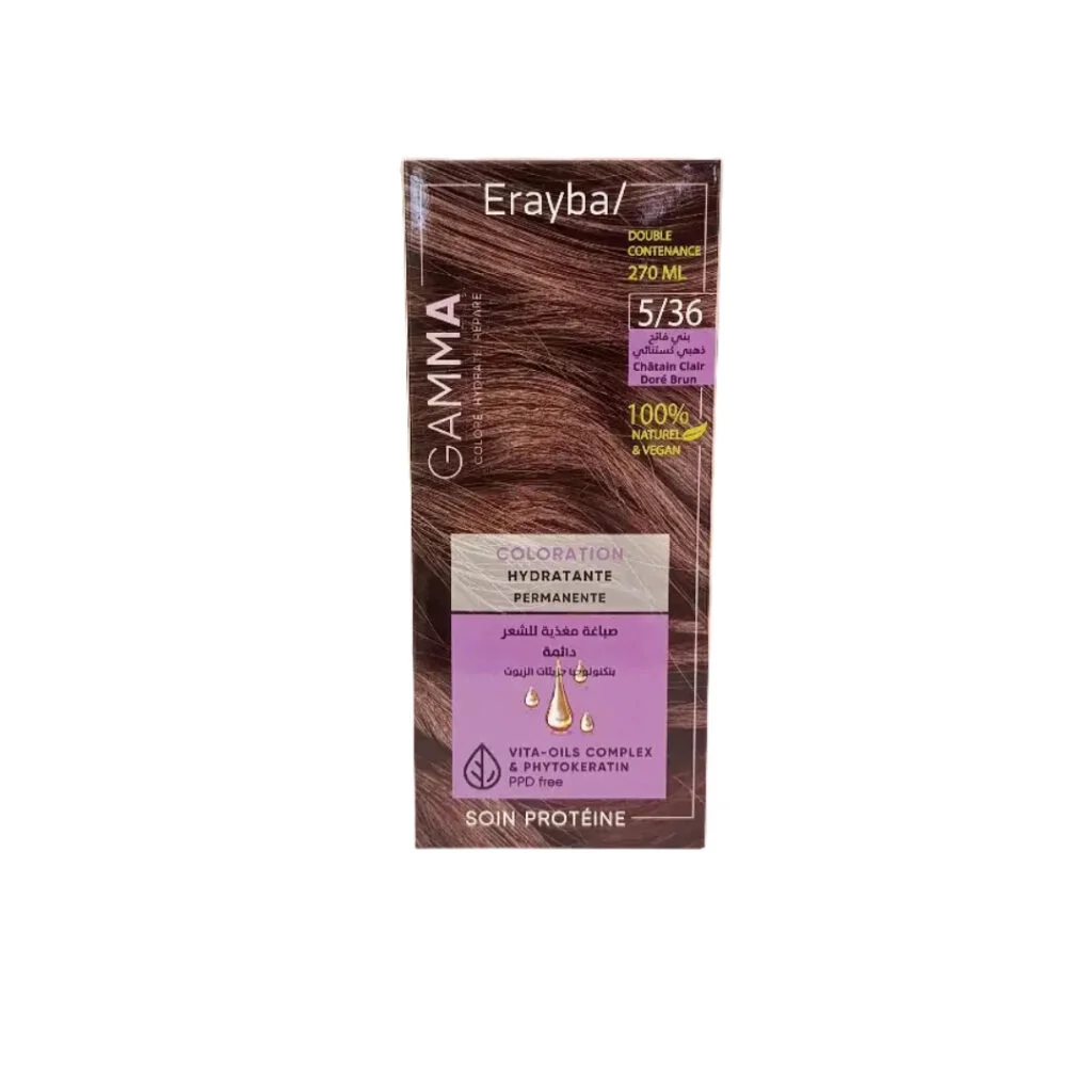La teinte 5/36 Châtain Clair Doré Irisé d’Erayba Gamma Next combine des reflets dorés et irisés pour un résultat naturel et éclatant. Formulée sans ammoniaque, PPD ni silicones, elle est enrichie en phytokératine, huile de macadamia et vitamine C pour hydrater et protéger les cheveux. Elle assure une couverture optimale des cheveux blancs et convient à tous types de cheveux.