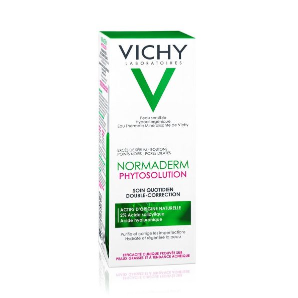 Pour remédier à ce problème cutané, les laboratoires Vichy ont développé Vichy Normaderm Phytosolution, un soin du visage quotidien qui possède une double correction. En effet, grâce à ses actifs dermatologiques anti-acné sélectionnés avec soin par la marque, ce soin agit sur deux niveaux :